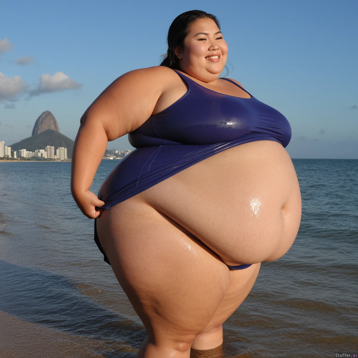 (((1girl, Asian ussbbw, ssbbw, thick thighs, extremely overweight, immobile, big loose wet top and skirt, morbid weight gain))), correct anatomy, standing, smiling, looking up, side view, bbw, gigantic belly, bloated belly, beach, Brazil, Rio de Janeiro, dawn, fat arms, huge ass. bottomheavy, booty, bubble_butt, carnival