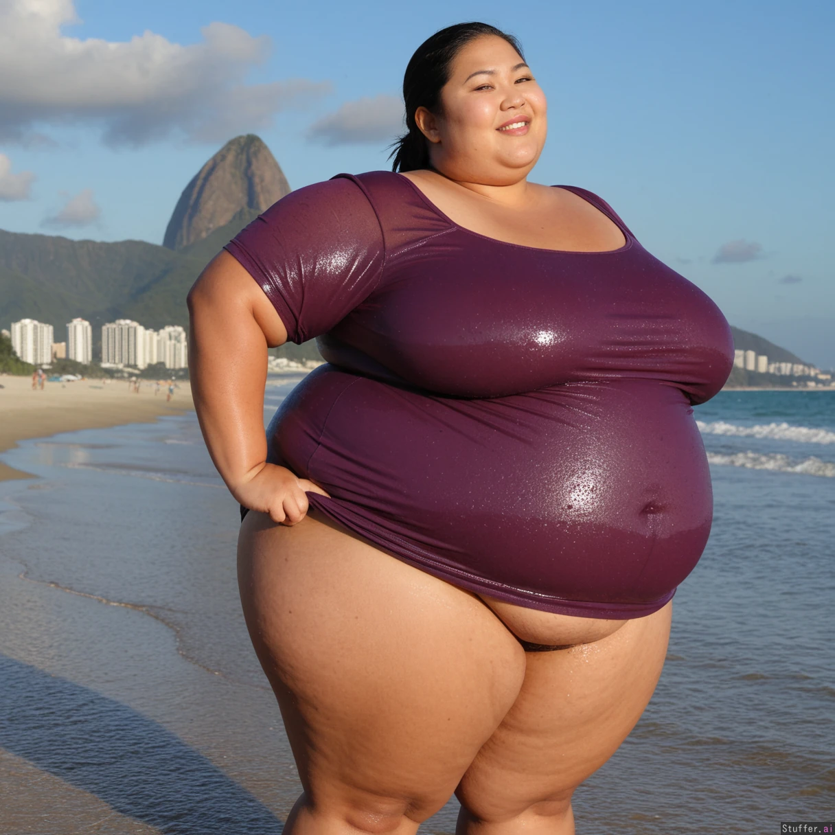 (((1girl, Asian ussbbw, ssbbw, thick thighs, extremely overweight, immobile, big loose wet top and skirt, morbid weight gain))), correct anatomy, standing, smiling, looking up, side view, bbw, gigantic belly, bloated belly, beach, Brazil, Rio de Janeiro, dawn, fat arms, huge ass. bottomheavy, booty, bubble_butt, bloated, carnival