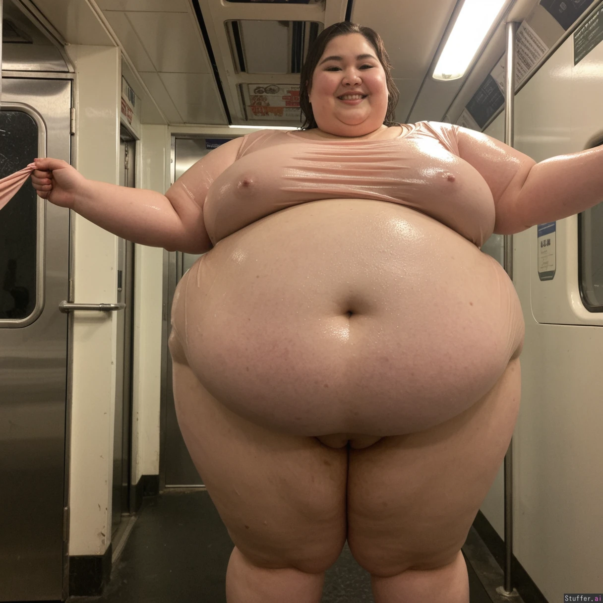 (((1girl, Asian ussbbw, ssbbw, thick thighs, extremely overweight, immobile, big loose wet top and skirt, morbid weight gain))), correct anatomy, standing, smiling, looking up, side view, bbw, gigantic belly, bloated belly, sweaty, subway ride, dawn, fat arms, huge ass. bottomheavy, booty, bubble_butt, bloated, carnival