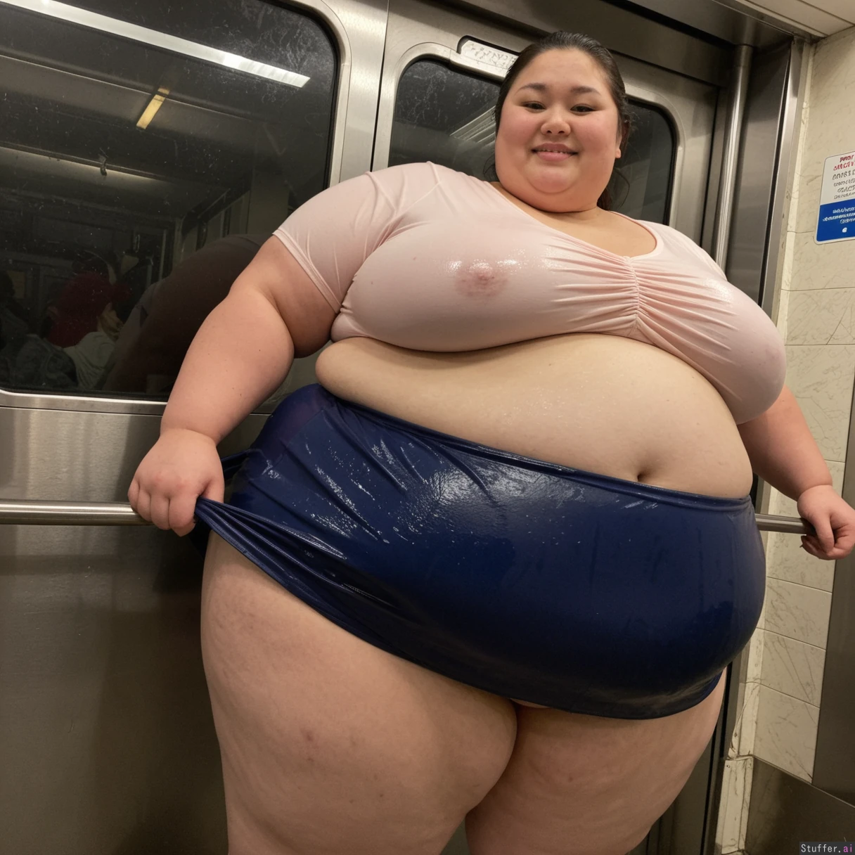 (((1girl, Asian ussbbw, ssbbw, thick thighs, extremely overweight, immobile, big loose wet top and skirt, morbid weight gain))), correct anatomy, standing, smiling, looking down at viewer, side view, bbw, gigantic belly, bloated belly, sweaty, subway ride, dawn, fat arms, huge ass. bottomheavy, booty, bubble_butt, bloated, carnival, spreading legs