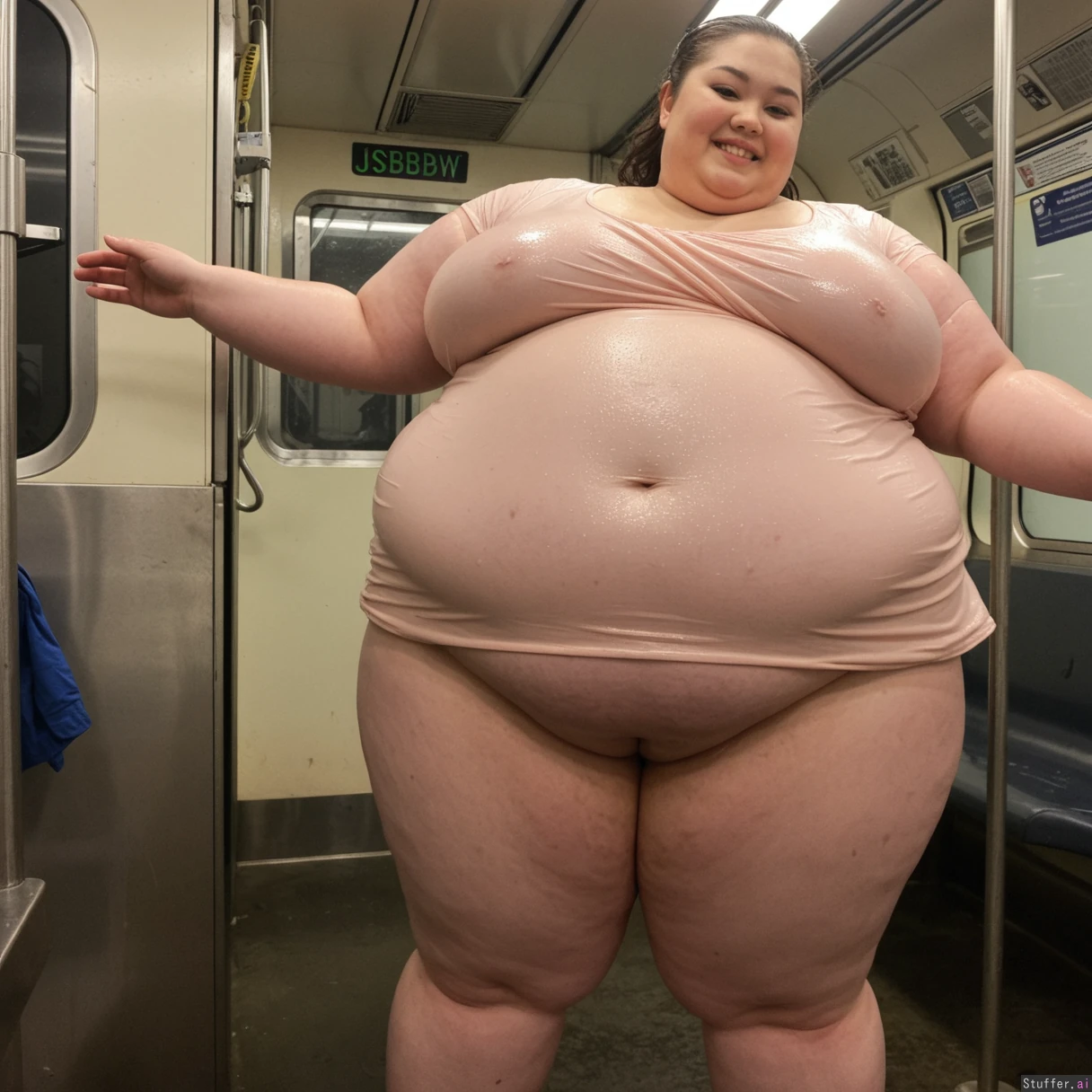 (((1girl, Asian ussbbw, ssbbw, thick thighs, extremely overweight, immobile, big loose wet top and skirt, morbid weight gain))), correct anatomy, standing, smiling, looking down at viewer, side view, bbw, gigantic belly, bloated belly, sweaty, subway ride, dawn, fat arms, huge ass. bottomheavy, booty, bubble_butt, bloated, carnival, spreading legs