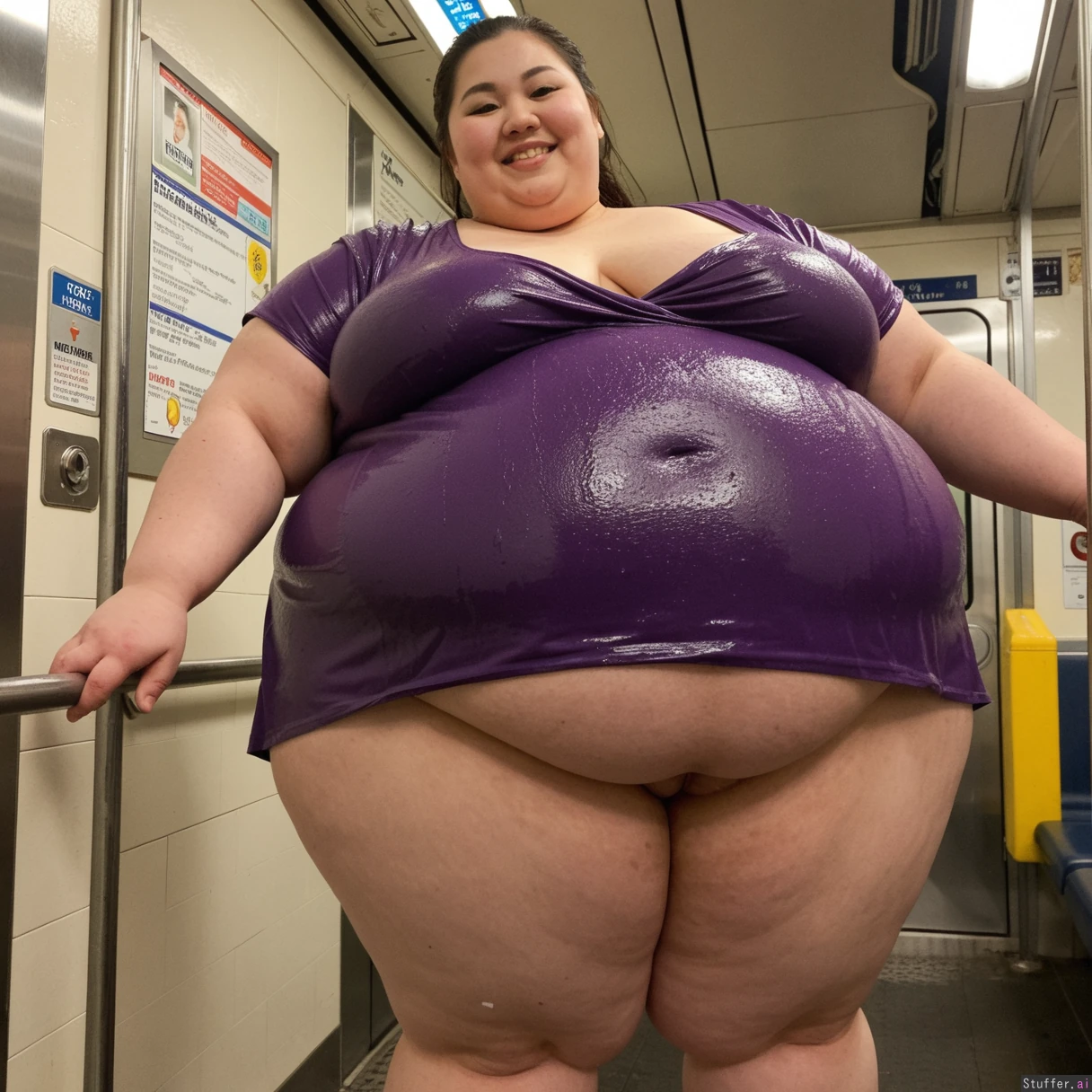 (((1girl, Asian ussbbw, ssbbw, thick thighs, extremely overweight, immobile, big loose wet top and skirt, morbid weight gain))), correct anatomy, standing, smiling, looking down at viewer, side view, bbw, gigantic belly, bloated belly, sweaty, subway ride, dawn, fat arms, huge ass. bottomheavy, booty, bubble_butt, bloated, carnival, spreading legs