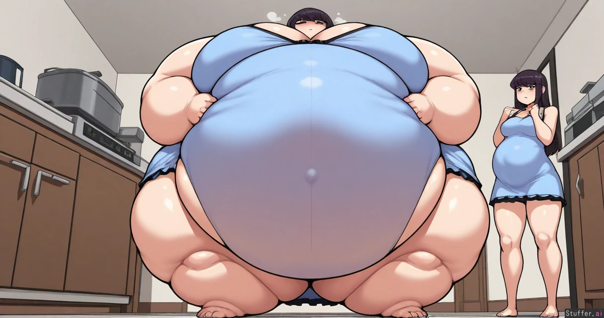 Best quality, top rated, high res, masterpiece, perfect anatomy, score_7, krekkov, Solo, 1girl, tall, Kitchen, (standing, heavy breathing, exhausted, weight conscious), hands on belly, ((Shoko komi)), (Long blue sundress, covered navel), Low angle, (((Morbidly Obese, immobile, inflation, inflation_fetish, extreme weight gain))), ((Fat round face, double chin, fat plump arms)), (Gigantic breasts), gigantic hips, gigantic ass, gigantic thighs, gigantic belly_bulge, belly_between_legs, belly_on_ground, legs_apart