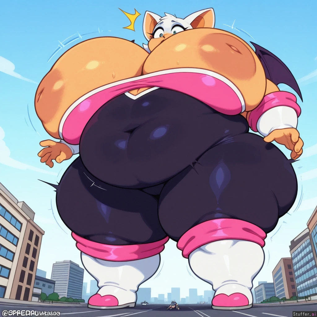 1girl, solo, speedoru(artist), wamudraws(artist), perfect proportions, flat colors, one belly button, Rouge the bat, furry, anthro, bodysuit, exposed ass, skindentation, ((gigantic hips, gigantic thighs, obese legs, obese fat arms, morbidly obese, overinflated, panic, shocked, exposed breasts, inverted nipples, puffy areola, enormous breasts, big belly)), (bursting breasts, undersized clothes, expansion, wardrobe malfunction, taut clothes, torn clothes,:1.2), full body, ass expansion, breast expansion, (Giantess), miniature city, outdoors, (growth:2), limbs outstretched, low-angle view,