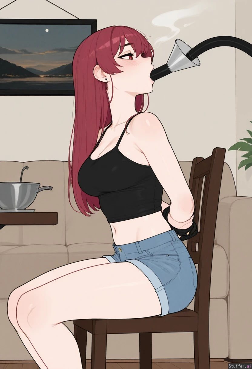 Solo, Krekkov (artist), KAMII MOMORU(artist), (Flat colors), perfect proportions, pale skin, houshou_marine(hololive), red shoulder length hair, flirty, (((black top, jean shorts))), living room, sitting on a chair, hands tied behind her back, (black hose in her mouth, funnel feeding, force feeding), (Side view), medium breasts, (Skinny, relaxed: 0.9) (Chubby, nervous, chubby belly: 0.1)
