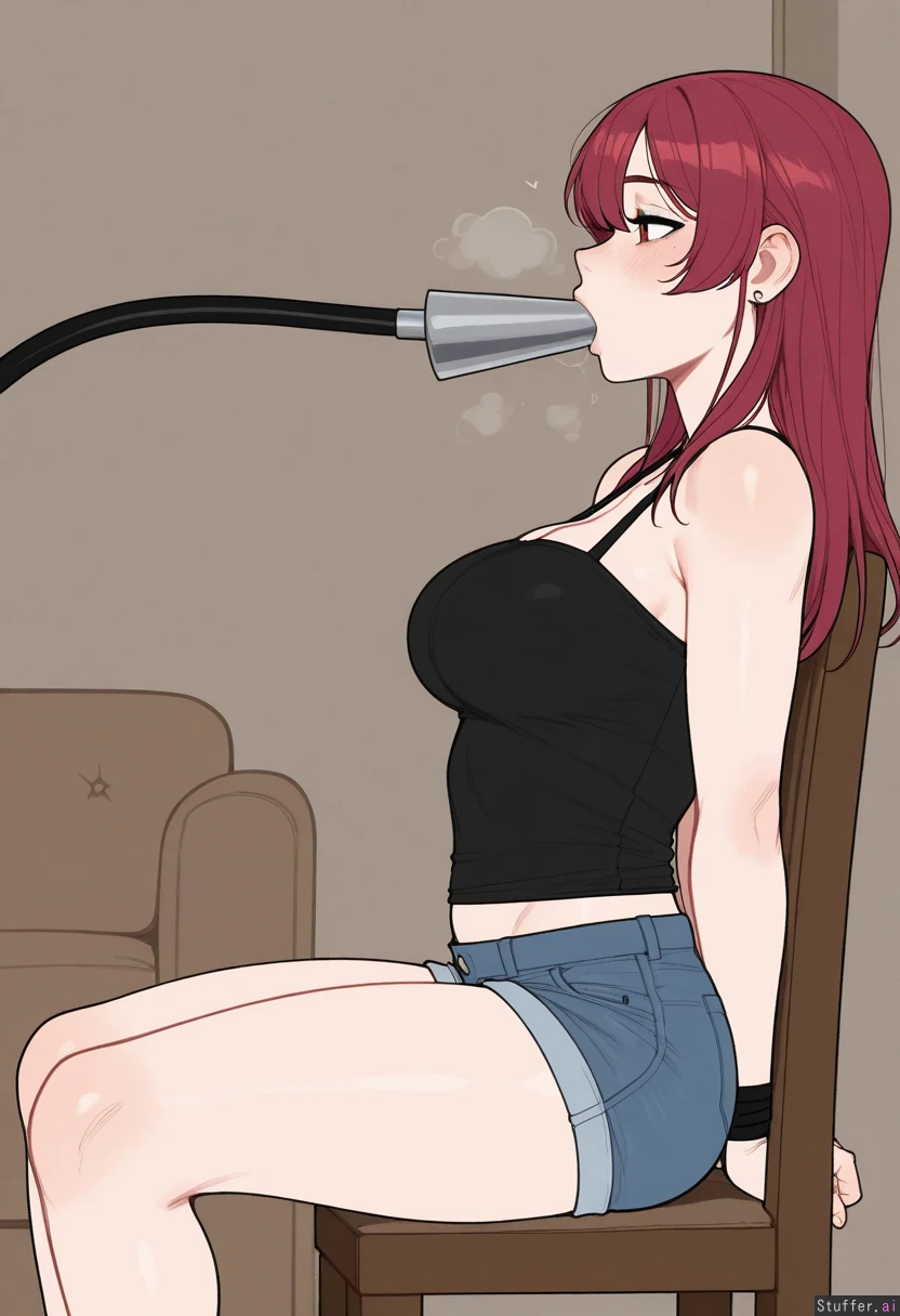 Solo, Krekkov (artist), KAMII MOMORU(artist), (Flat colors), perfect proportions, pale skin, houshou_marine(hololive), red shoulder length hair, flirty, (((black top, jean shorts))), living room, sitting on a chair, hands tied behind her back, (black hose in her mouth, funnel feeding, force feeding), (Side view), medium breasts, (Skinny, relaxed: 0.9) (Chubby, nervous, chubby belly: 0.1)