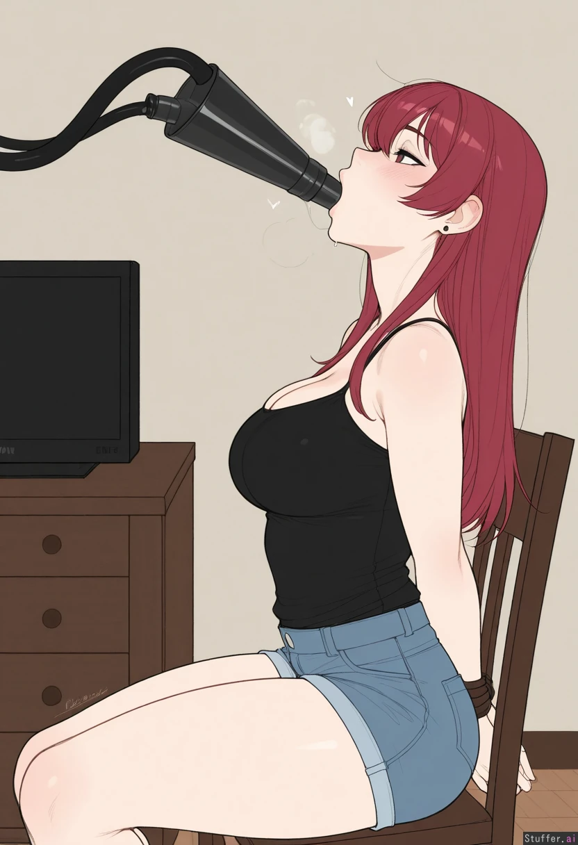 Solo, Krekkov (artist), KAMII MOMORU(artist), (Flat colors), perfect proportions, pale skin, houshou_marine(hololive), red shoulder length hair, flirty, (((black top, jean shorts))), living room, sitting on a chair, hands tied behind her back, (black hose in her mouth, funnel feeding, force feeding), (Side view), medium breasts, (Skinny, relaxed: 0.5) (Chubby, nervous, chubby belly: 0.5)