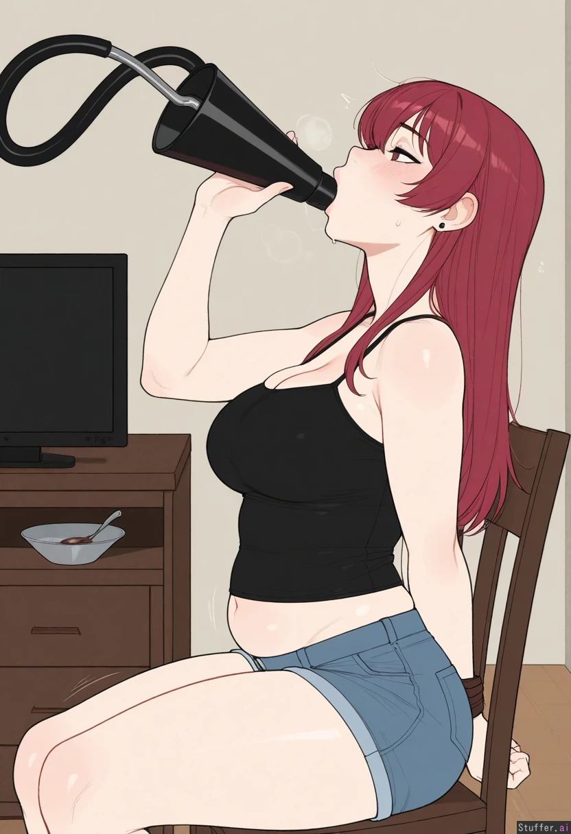 Solo, Krekkov (artist), KAMII MOMORU(artist), (Flat colors), perfect proportions, pale skin, houshou_marine(hololive), red shoulder length hair, flirty, (((black top, jean shorts))), living room, sitting on a chair, hands tied behind her back, (black hose in her mouth, funnel feeding, force feeding), (Side view), medium breasts, (Skinny, relaxed: 0.13) (Chubby, nervous, chubby belly: 0.87)