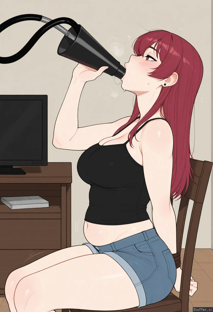 Solo, Krekkov (artist), KAMII MOMORU(artist), (Flat colors), perfect proportions, pale skin, houshou_marine(hololive), red shoulder length hair, flirty, (((black top, jean shorts))), living room, sitting on a chair, hands tied behind her back, (black hose in her mouth, funnel feeding, force feeding), (Side view), medium breasts, (Skinny, relaxed: 0.10) (Chubby, nervous, chubby belly: 0.90)