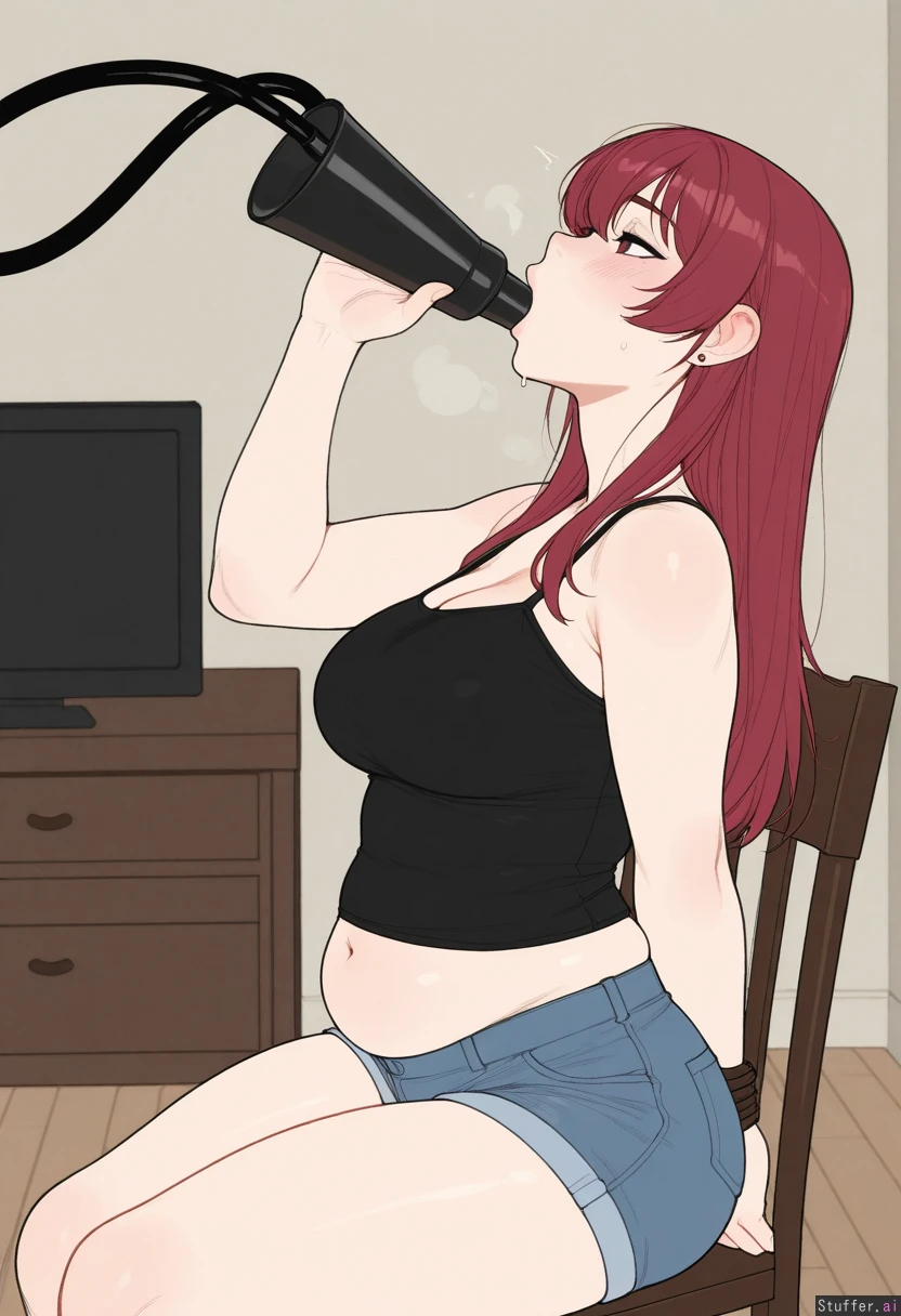 Solo, Krekkov (artist), KAMII MOMORU(artist), (Flat colors), perfect proportions, pale skin, houshou_marine(hololive), red shoulder length hair, flirty, (((black top, jean shorts))), living room, sitting on a chair, hands tied behind her back, (black hose in her mouth, funnel feeding, force feeding), (Side view), medium breasts, (Skinny, relaxed: 0.01) (Chubby, nervous, chubby belly: 0.99)