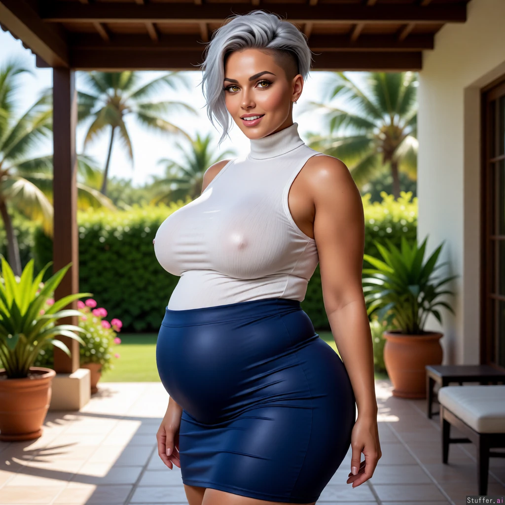 (Very realistic, high quality, perfect anatomy, perfect hands, realistic skin texture) (Solo woman standing on a shaded tropical patio posing sexily with her belly pointed sideways) (Light brown skin Undercut messy short silver hair Big round eyes Pure Silver hair Narrow jaw Bright Gold irises Gorgeous face Long prominent nose Thin full lips Thin cheeks Low cheekbones Wide forehead and wide eyebrows Tall forehead Inverted Triangular face Perfect teeth Pointy face Long nose Arched nose bridge Latina face) (Sexy curvy body Most obese body possible Incredibly massive breasts Enormous wide hips Gigantic fat thighs Massive hips Hyper massive obese bloated belly Ultra colossal belly Largest possible belly):25 (Sleeveless turtleneck and tight high-waisted skirt) (Pleased and aroused) (Feedee gamer fat fetishist)