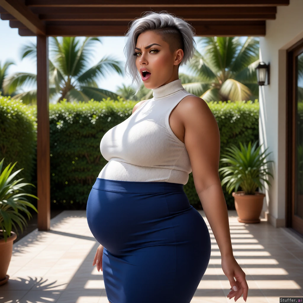 (Very realistic, high quality, perfect anatomy, perfect hands, realistic skin texture) (Solo woman standing on a shaded tropical patio with her belly pointed sideways) (Light brown skin Undercut messy short silver hair Big round eyes Pure Silver hair Narrow jaw Bright Gold irises Gorgeous face Long prominent nose Thin full lips Thin cheeks Low cheekbones Wide forehead and wide eyebrows Tall forehead Inverted Triangular face Perfect teeth Pointy face Long nose Arched nose bridge Latina face) (Sexy curvy body Most obese body possible Incredibly massive breasts Enormous wide hips Gigantic fat thighs Massive hips Hyper massive obese bloated belly Ultra colossal belly Largest possible belly) (Sleeveless turtleneck and tight high-waisted skirt) (Moaning and smug) (Feedee gamer fat fetishist)