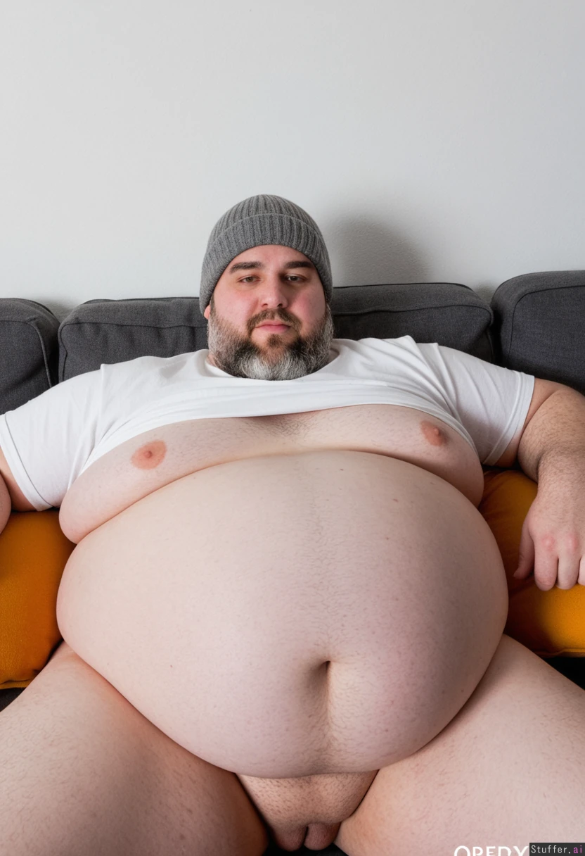 male solo grey_body grey_skin white_shirt big_belly gigantic_belly bloated_belly obese_male obese overweight couch buzz_cut beard beanie grey_hair