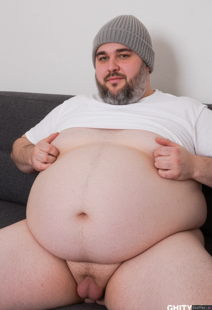 male solo grey_body grey_skin white_shirt big_belly gigantic_belly bloated_belly obese_male obese overweight couch buzz_cut beard beanie grey_hair