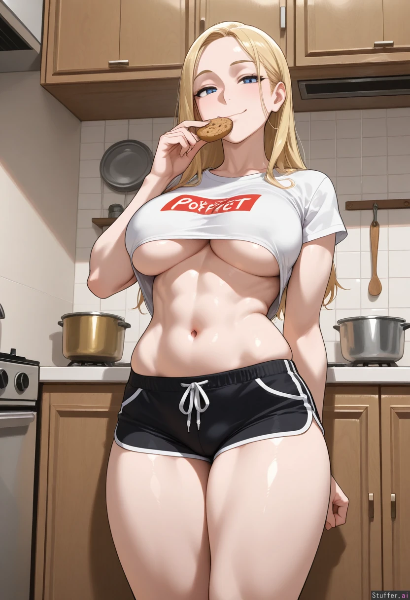 masterpiece, best quality, score_7. Krekkov_artist, KipKipTei_artist, KAMII_MOMOROU_artisit, beautiful_shading, highly_detailed, best_quality, perfect_anatomy, perfect_proportions, perfect_lighting, soft_lighting, 1woman, milf, solo adult, tall, Long blonde hair, bangs, smiling, sexy face, pale skin, , (Kitchen) , standing , Flushed face, t-shirt, shorts, (slim:1.0), eating cookies, small_waist, (skindentation), underboob, (toned belly), midriff, (Athletic build)