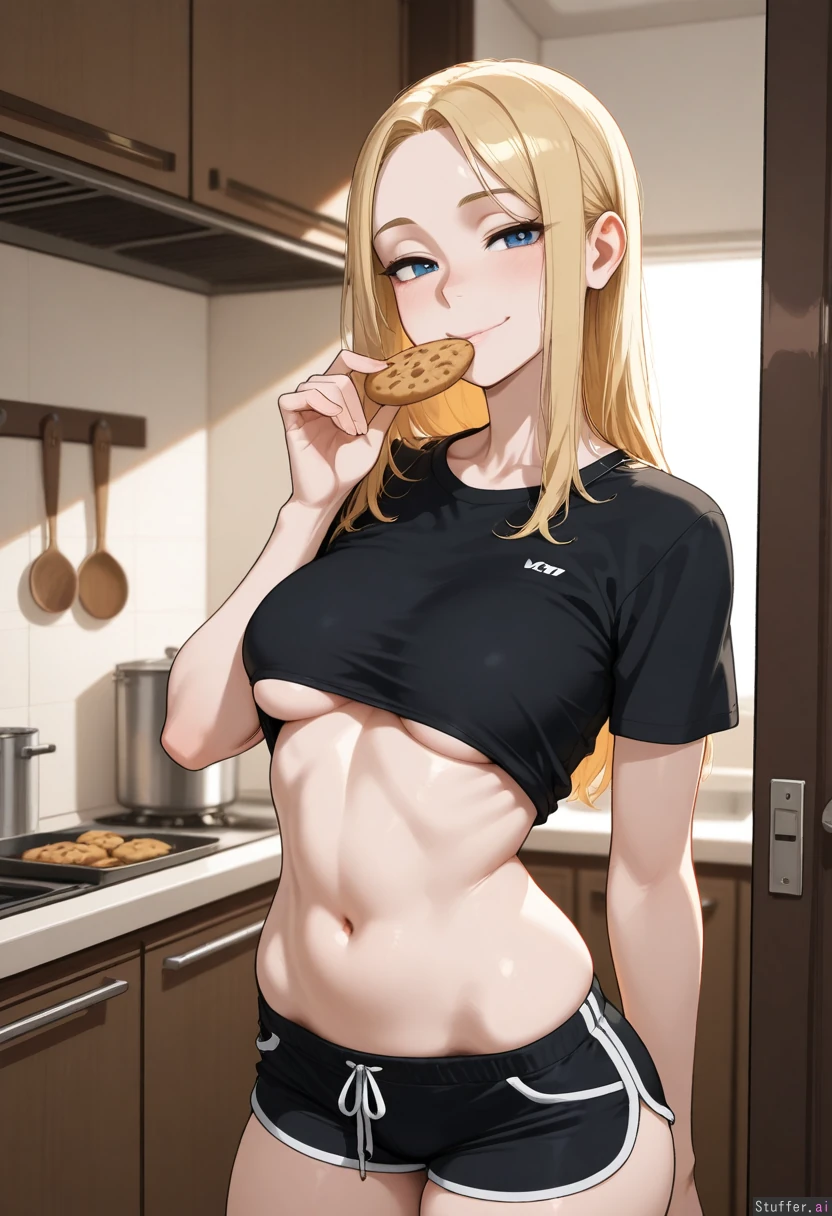 masterpiece, best quality, score_7. Krekkov_artist, KipKipTei_artist, KAMII_MOMOROU_artist, beautiful shading, highly detailed, best quality, perfect anatomy, perfect proportions, perfect lighting, soft lighting, 1woman, milf, solo adult, tall, Long blonde hair, bangs, smiling, sexy face, pale skin, (Kitchen) , standing , Flushed face, t-shirt, shorts, (slim:1.4), eating cookies, small_waist, (skindentation), underboob, (toned belly), midriff, (Athletic build), Modest breasts