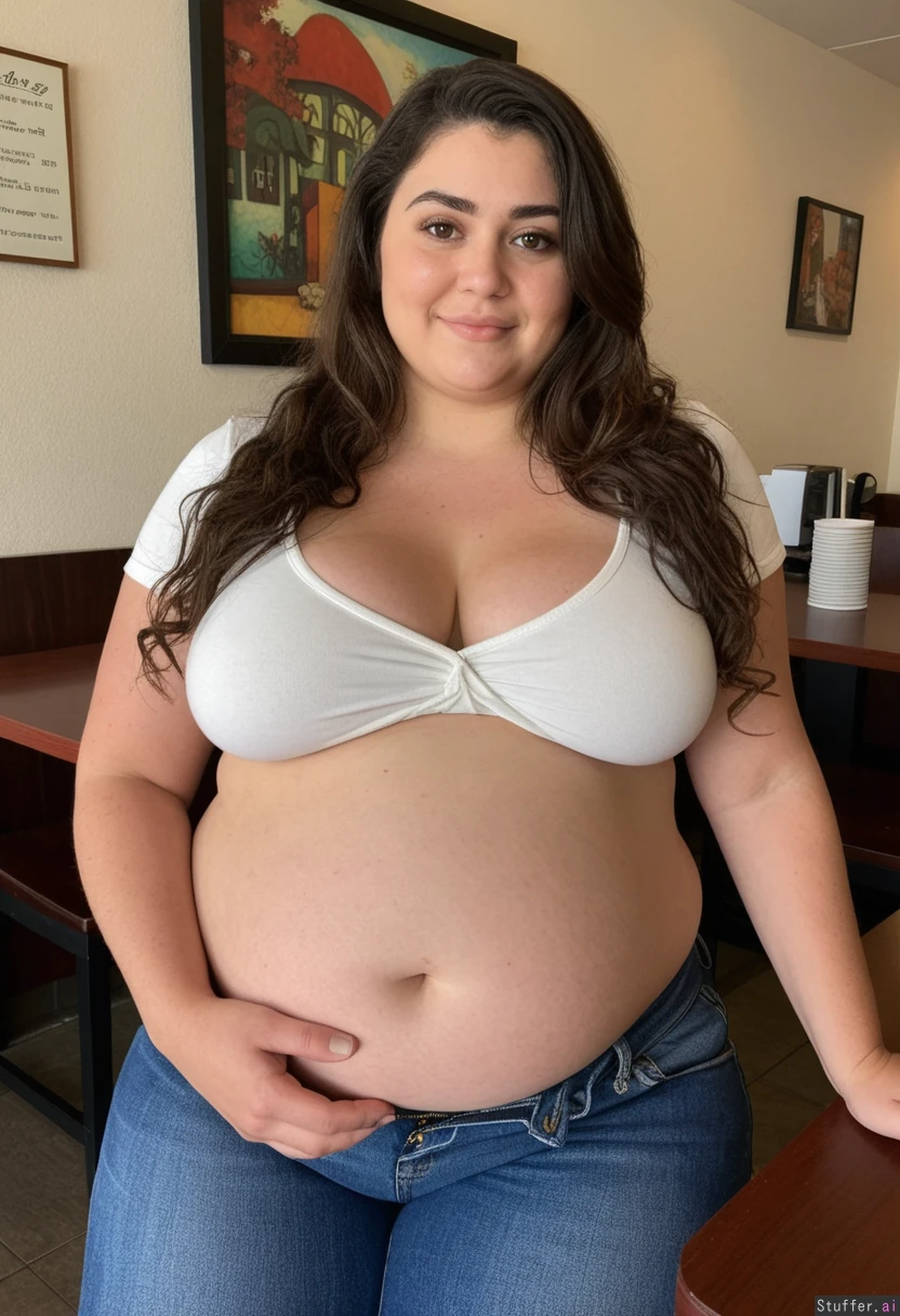 Selfie 30 year old Jewish woman Long Wavy hair Beautiful brown eyes , Tight shirt , jeans Curvy Sitting at cafe (bump belly:1.8) (chubbiness:1.7)