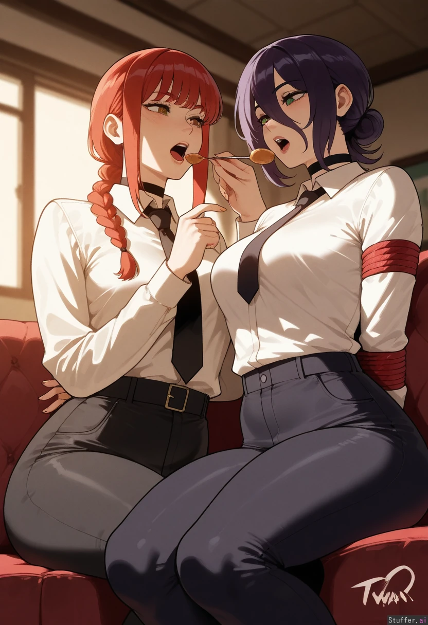 Masterpiece, best_quality, beautiful, vibrant colors, dim light, (2girls), nyantcha(artist), ((fully_clothed)), tight clothes, slight belly under clothes, (side belly), open mouth, thick thighs, ((makima_(chainsaw_man) is feeding reze_(chainsaw_man))), Reze is sitting and eating, force_feeding, tied_up, Reze is bigger than makima_(chainsaw_man)