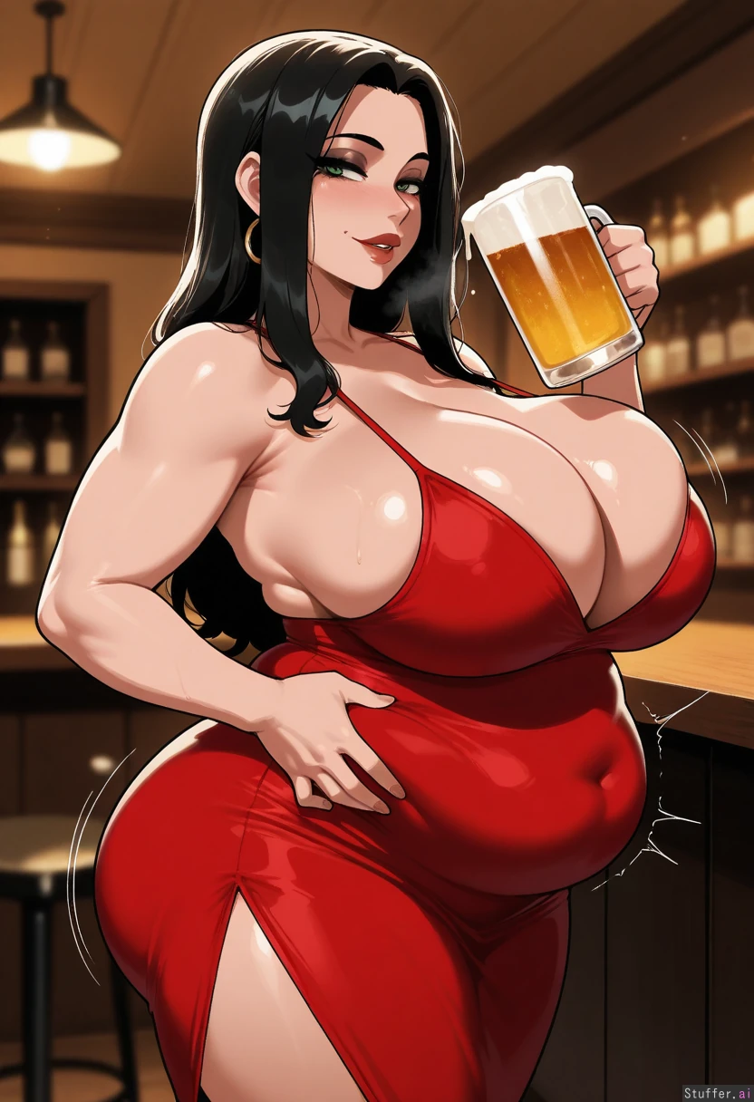 solo, 1woman, milf, adult, masterpiece, amazing resolution, nyantcha(artist), krekkov(artist), dramatic lighting, intricate details, detailed eyes, hdr, best quality, (soft shading), dim lighting, realistic lighting At the bar, dark lighting, (long black hair, green eyes), dark eyeshadow, sexy face, dominant, flirty, Overweight figure, (fat belly), chubby build, curvy, voluptuous, (weight gain), (Skimpy red dress) (Huge breasts), (breast expansion), top heavy, cleavage, bursting breasts, sagging boobs Expanding waist, wider hips, bigger ass, expanding butt Standing, looking at viewer, drinking beer, beer in hand