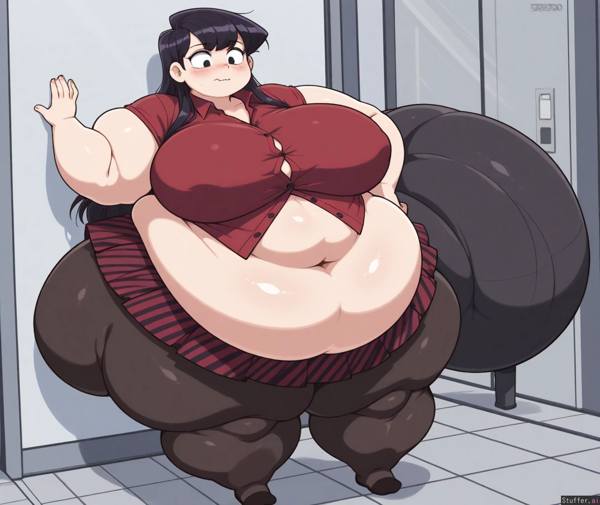 Speedoru(artist), wamudraws(artist), kipteitei, ((lineless:1.4)), perfect proportions, flat colors, only one belly button, (shouko_komi), long hair, button-up shirt, button gaps, high-waist_skirt, pantyhose, skindentation, embarrassed, blushing, full_body, (obese_legs, gigantic_ass:1.6), ((small_boobs)), (((morbidly obese, weight gain))), (ssbbw:1.2, hyperfat, obese limbs, morbidly obese:1.4, weight gain, fat feet, fat arms, arm rolls, fat face:1.1), fat upper body, fat neck, pretty fat face, Fat girl, chubby double chin, chubby neck, wide face,), (Wet), (Wet hair), (Water), (Solo), (Full body shot), (Day time), (In elevator), pressing ass against wall,