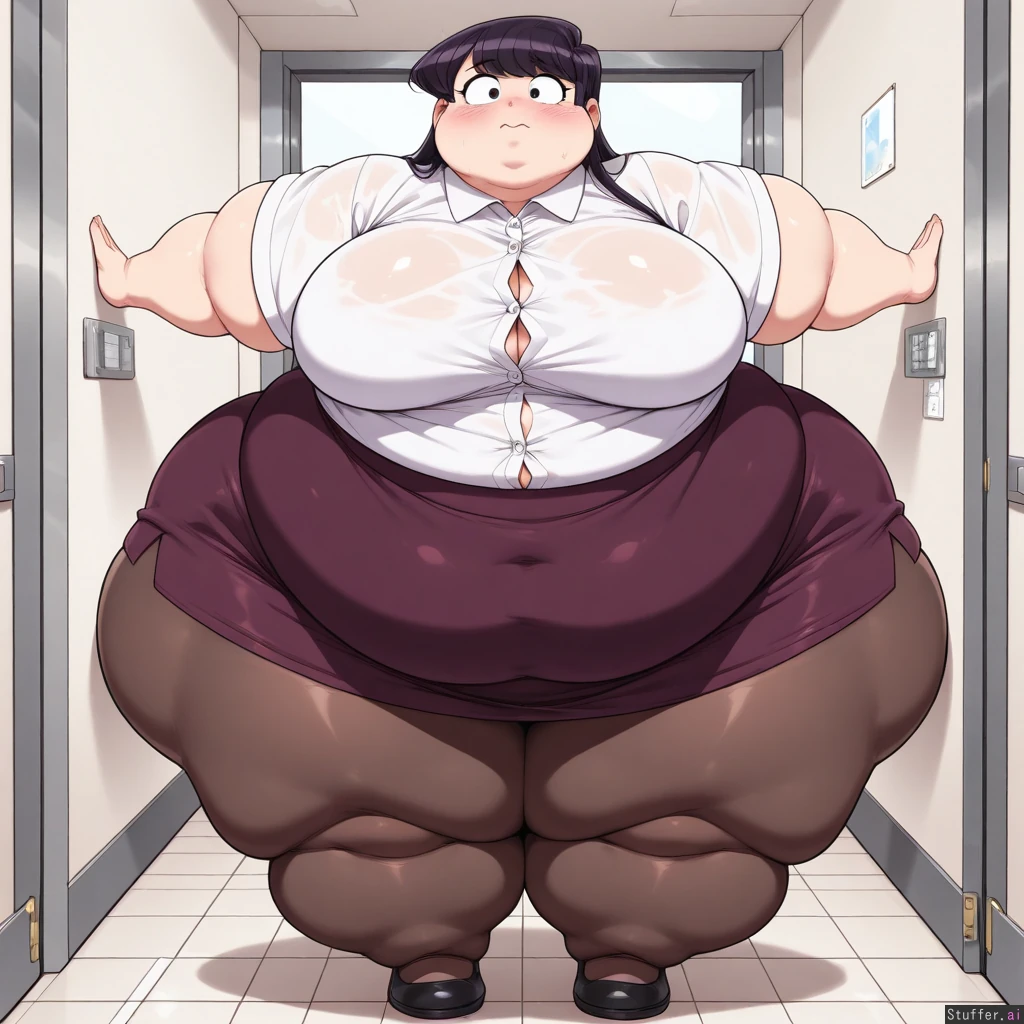 Speedoru(artist), wamudraws(artist), kipteitei, ((lineless:1.4)), perfect proportions, flat colors, only one belly button, (shouko_komi), long hair, office clothes, button-up shirt, button gaps, high-waist_skirt, narrow waist, pantyhose, pencil skirt, pantyhose, dress shoes, skindentation, embarrassed, blushing, full_body, (obese_legs, gigantic_ass:1.6), ((small_boobs)), (((morbidly obese, weight gain))), (ssbbw:1.2, hyperfat, obese limbs, morbidly obese:1.4, weight gain, fat feet, fat arms, arm rolls, fat face:1.1), fat upper body, fat neck, pretty fat face, Fat girl, chubby double chin, chubby neck, wide face,), (Wet), (Wet hair), (Water), (Solo), (Full body shot), (Day time), (In elevator), pressing hips against wall, (from front, Front view),