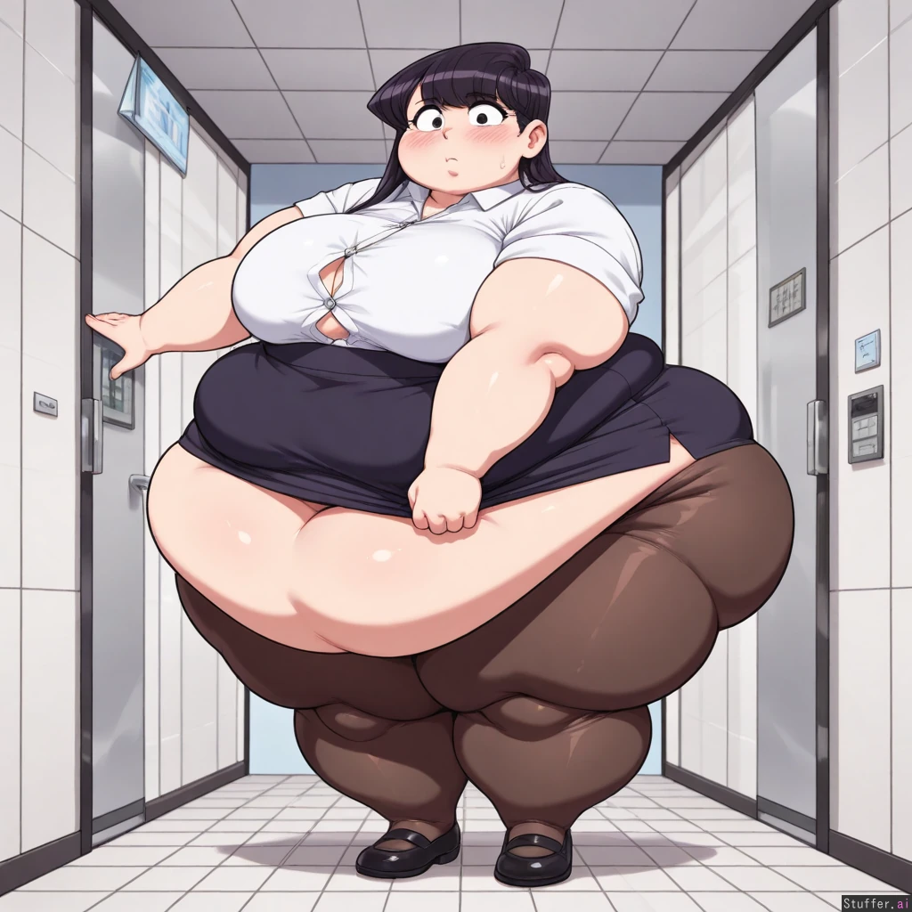 Speedoru(artist), wamudraws(artist), kipteitei, ((lineless:1.4)), perfect proportions, flat colors, only one belly button, (shouko_komi), long hair, office clothes, button-up shirt, button gaps, high-waist_skirt, narrow waist, pantyhose, pencil skirt, pantyhose, dress shoes, skindentation, embarrassed, blushing, full_body, (obese_legs, gigantic_ass:1.6), ((small_boobs)), (((morbidly obese, weight gain))), (ssbbw:1.2, hyperfat, obese limbs, morbidly obese:1.4, weight gain, fat feet, fat arms, arm rolls, fat face:1.1), fat upper body, fat neck, pretty fat face, Fat girl, chubby double chin, chubby neck, wide face,), (Wet), (Wet hair), (Water), (Solo), (Full body shot), (Day time), (In elevator), skirt tug, (from front, Front view),