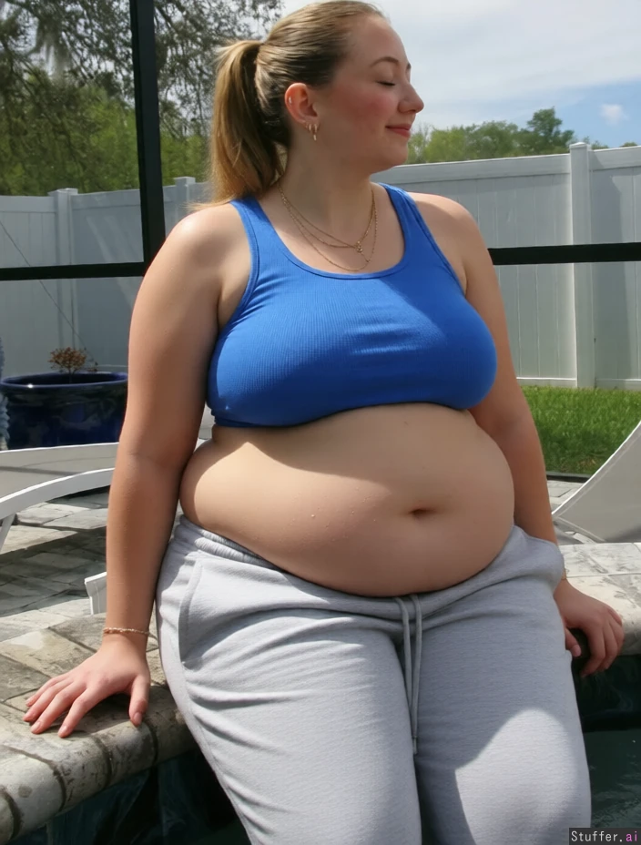 wearing sweatpants and tank top Huge_weight_gain fat_body fat_ belly saggy_fat_breasts fat_rolls fat_waist extremely_fat make her arms fatter Titty_jiggle_50% 60%_torpedo_tits_strength_28