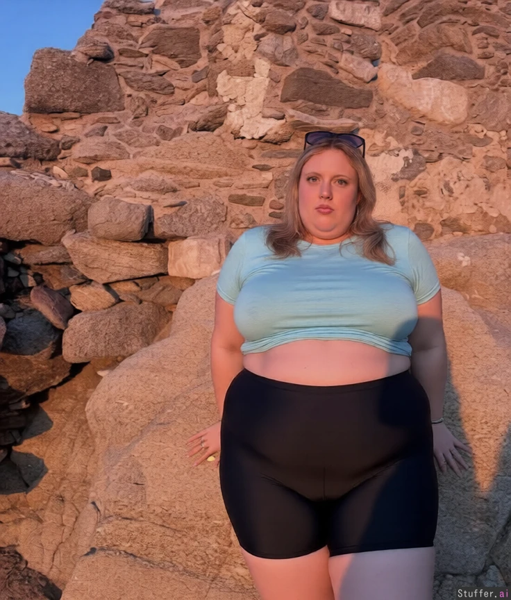 Wearing spandex shorts and a shirt Huge_weight_gain fat_body fat_ belly saggy_fat_breasts fat_rolls fat_waist extremely_fat make her arms fatter make her face fat Titty_jiggle_50% 60%_torpedo_tits_strength_28