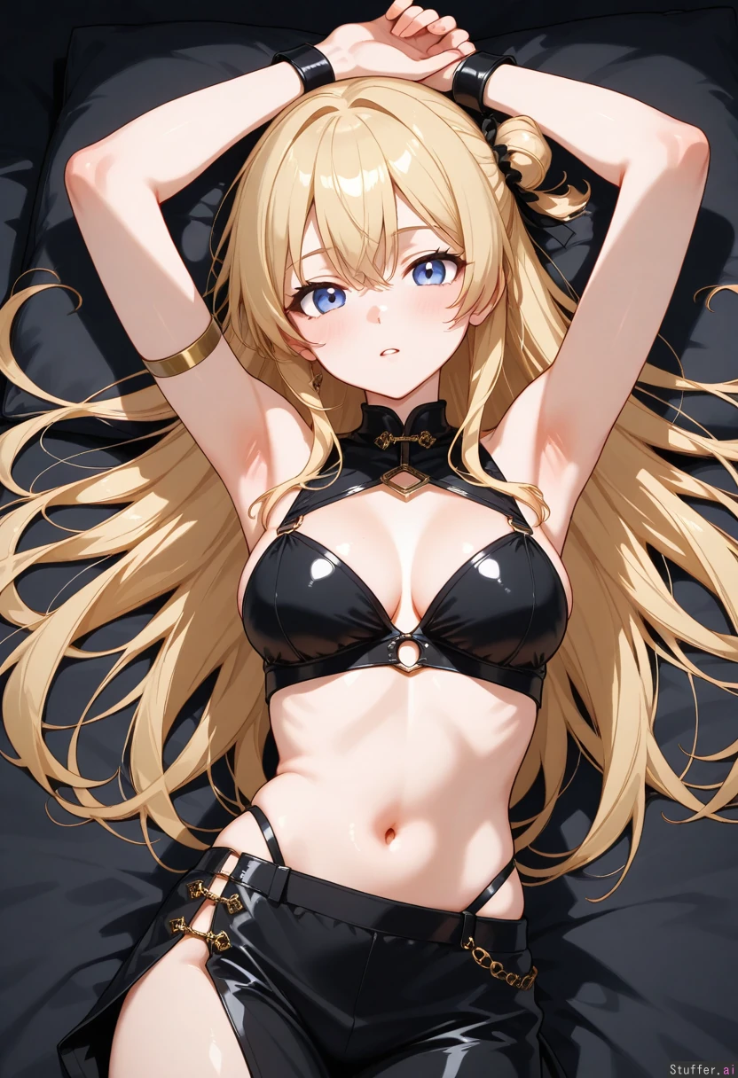 arms_above_head, sticking out chest,