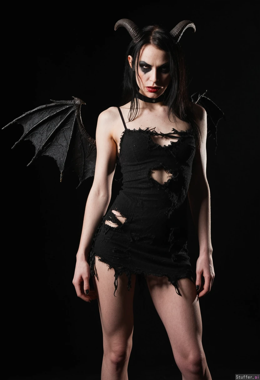 Female demon. Ragged torn short dress.