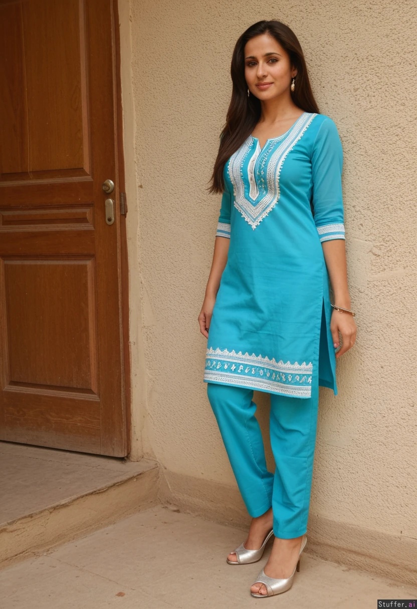 female. Wide hips. Perfect tits. thunder_thighs. Average build. Age is 45 years old. Traditional pakistani villager. Wearing tight_fit salwar kameez with heels.