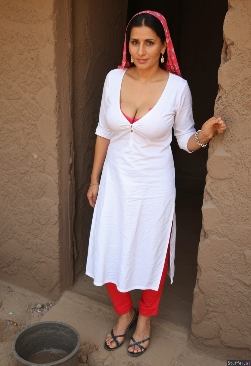 Traditional Pakistani village aunty. Age 45 years old. Age lines. Mud house.Cleavage. heels.