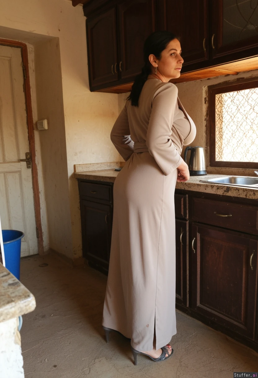 Traditional Pakistani village aunty. Age 45 years old. Age lines. Mud house. Wearing Abaya. Cleavage. Big natural tits. heels. Standing kn kitchen. Side view. Round ass.