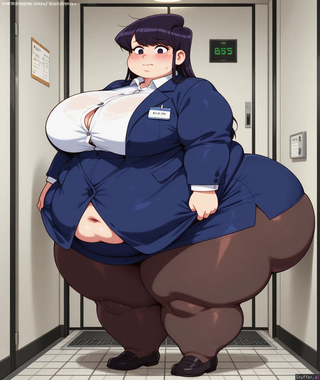 Speedoru(artist), wamudraws(artist), kipteitei, ((lineless:1.4)), perfect proportions, flat colors, only one belly button, (shouko_komi), long hair, office clothes, blue blazer, button-up shirt, button gaps, high-waist_skirt, narrow waist, pantyhose, pencil skirt, pantyhose, dress shoes, skindentation, embarrassed, blushing, full_body, (obese_legs, gigantic_ass:1.6), ((small_boobs)), (((morbidly obese, weight gain))), (ssbbw:1.2, hyperfat, obese limbs, morbidly obese:1.4, weight gain, fat feet, fat arms, arm rolls, fat face:1.1), fat upper body, fat neck, pretty fat face, Fat girl, chubby double chin, chubby neck, wide face,), (Wet), (Wet hair), (Water), (Solo), (Full body shot), (Day time), (In elevator), shirt tug, (from front, Front view),