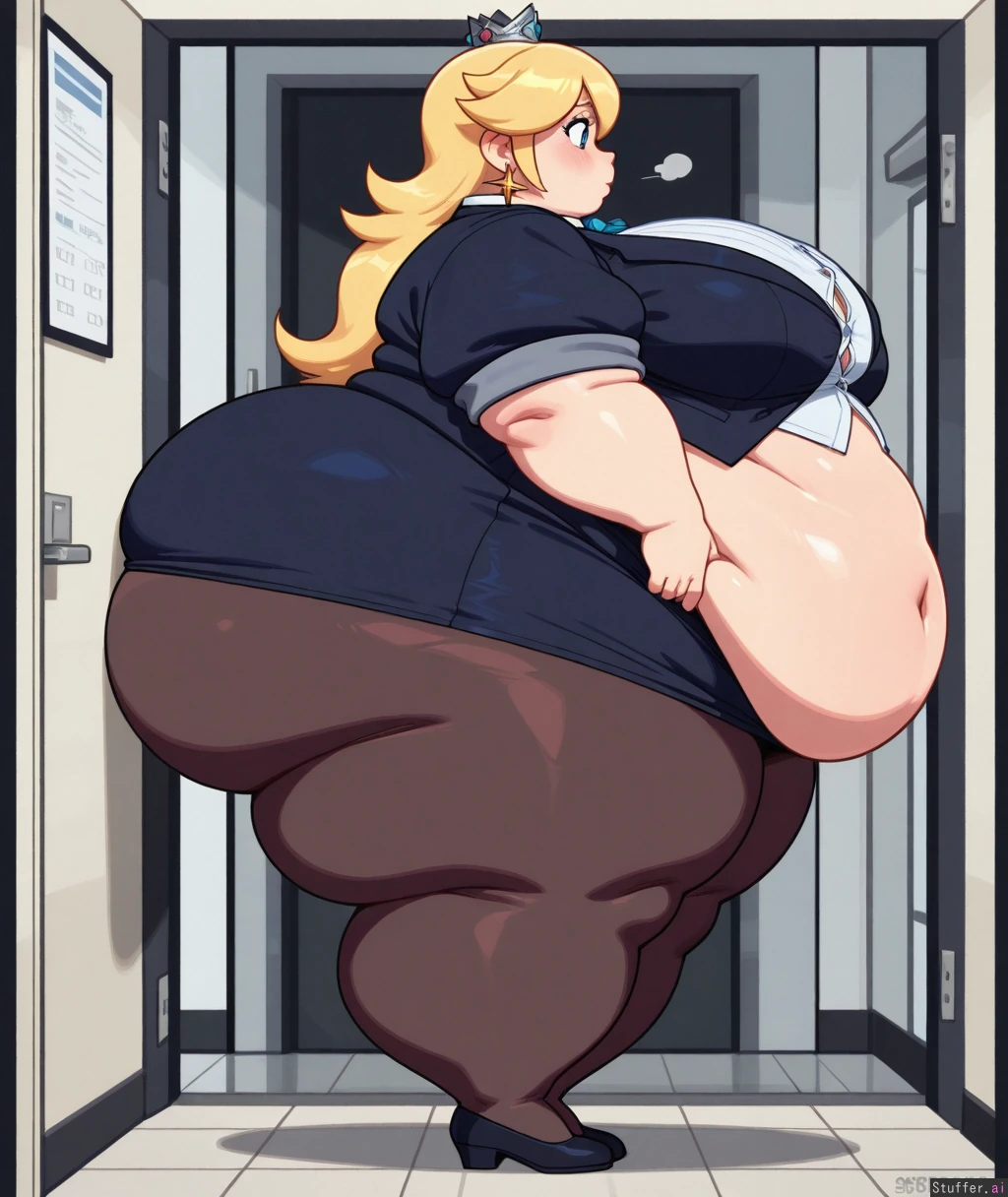 Speedoru(artist), wamudraws(artist), kipteitei, ((lineless:1.4)), perfect proportions, flat colors, only one belly button, ((princess Rosalina)), long hair, office clothes, black blazer, button-up shirt, button gaps, high-waist_skirt, narrow waist, pantyhose, pencil skirt, pantyhose, dress shoes, skindentation, embarrassed, blushing, full_body, (obese_legs, gigantic_ass:1.6), ((small_boobs)), (((morbidly obese, weight gain))), (ssbbw:1.2, hyperfat, obese limbs, morbidly obese:1.4, weight gain, fat feet, fat arms, arm rolls, fat face:1.1), fat upper body, fat neck, pretty fat face, Fat girl, chubby double chin, chubby neck, wide face,), (Solo), (Full body shot), (Day time), (In elevator), skirt tug, (from side, side view),