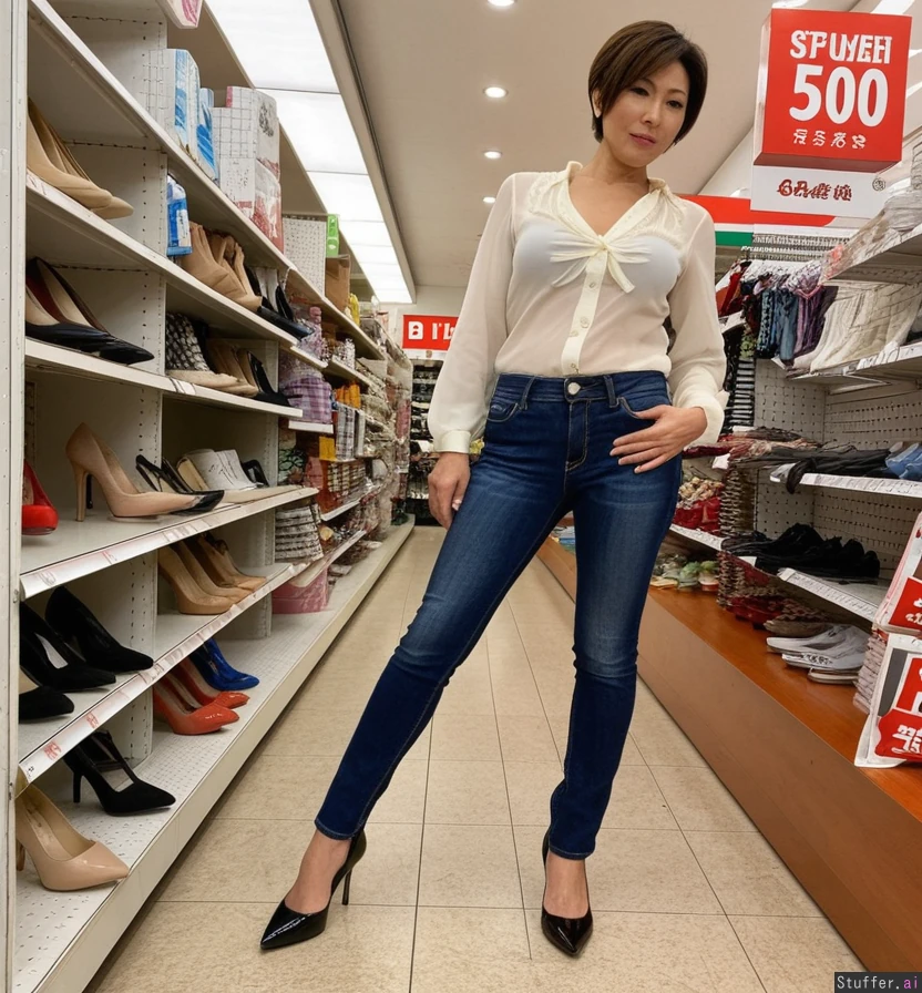 Japanese milf. Short hair. Age 50 years old. Wearing jeans and blouse. Stilleto heels Retail store. Hyper Hourglass physique