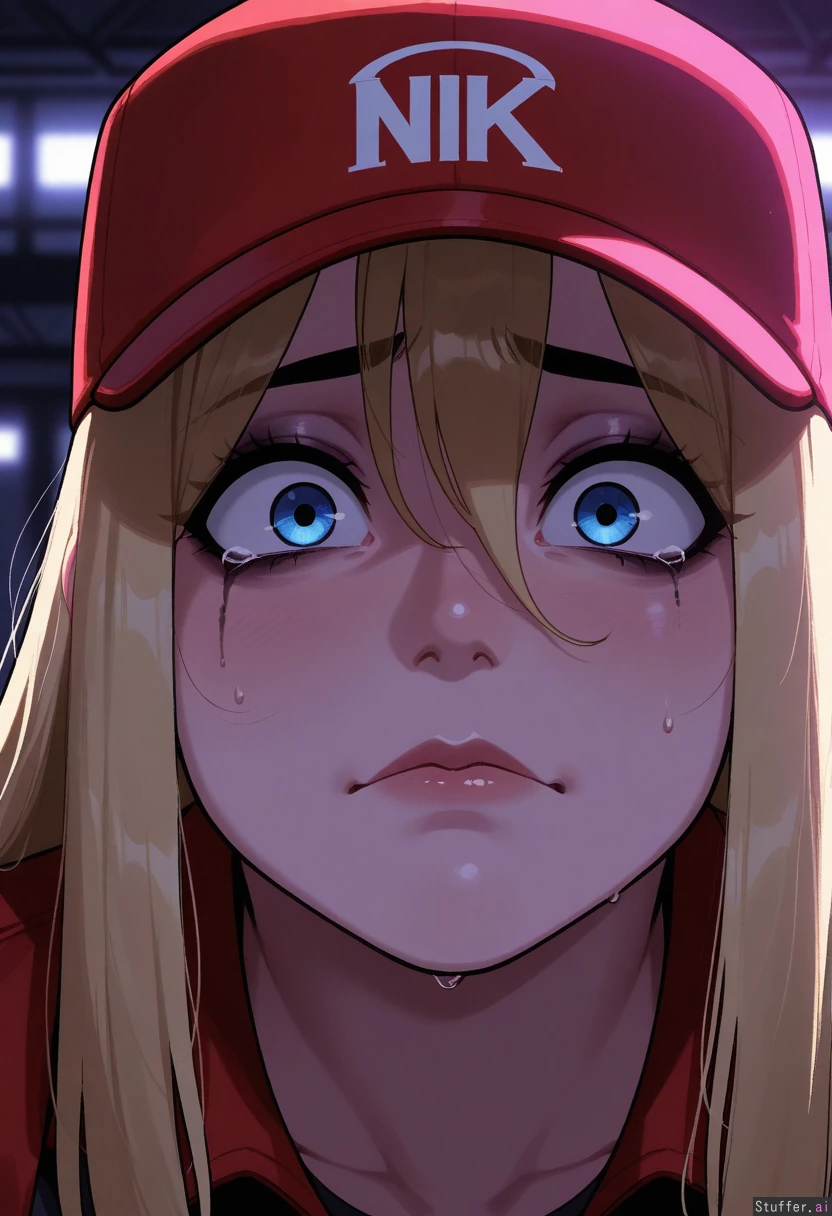 solo, masterpiece, amazing resolution, nyantcha(artist), krekkov(artist), dramatic lighting, intricate details, detailed eyes, hdr, best quality, (soft shading), dim lighting, realistic lighting, dark purple lighting (Bimbo, delivery driver, blonde hair, long hair, chubby, terrified), blue eyes, looking at viewer, scared, tearing_up, mouth closed, panicking, mouth closed, close up pov of her face, face focus, running_makeup, face only, red delivery driver hat