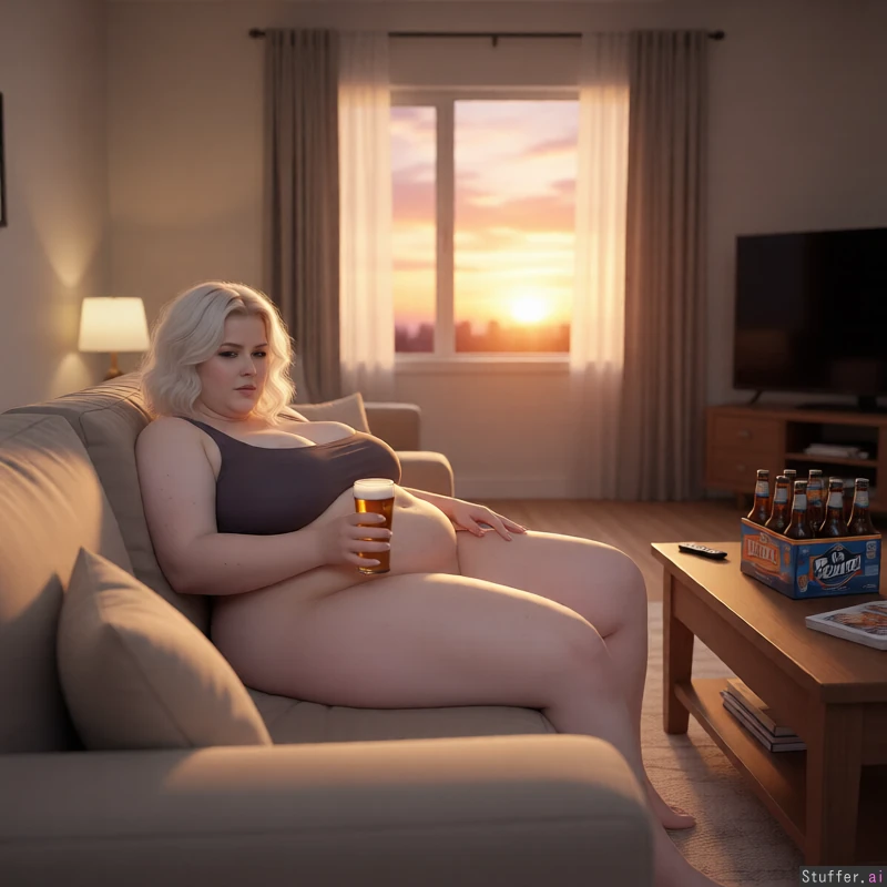 Lazily laying on couch, living room, sunset, pack of beers, beer in hand, tv remote