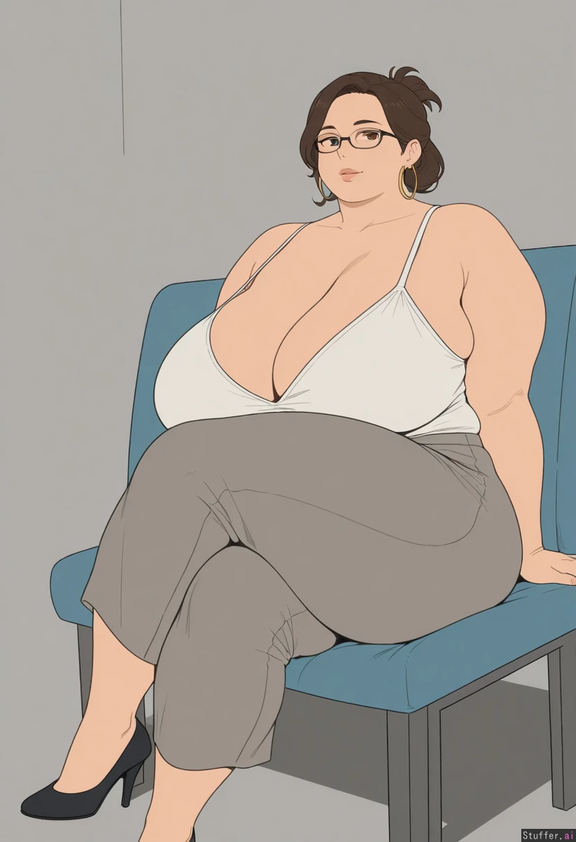 gigantic_breasts, sagging_breasts, massive_thighs, morbidly_obese_female, wife, crossed_legs, fine_outlines, flat_colors, long_breasts, fat_arms, hoop_earrings