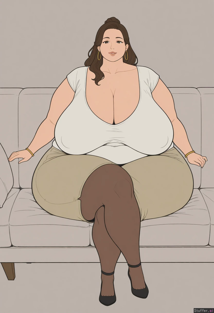 gigantic_breasts, sagging_breasts, massive_thighs, morbidly_obese_female, wife, crossed_legs, fine_outlines, flat_colors, long_breasts, fat_arms, hoop_earrings