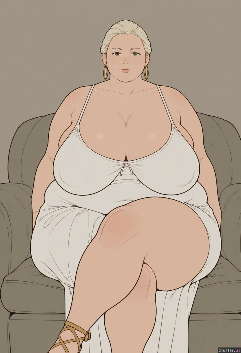 gigantic_breasts, sagging_breasts, massive_thighs, morbidly_obese_female, wife, crossed_legs, fine_outlines, flat_colors, long_breasts, (fat_arms:1.2), hoop_earrings, platinum_blonde_hair