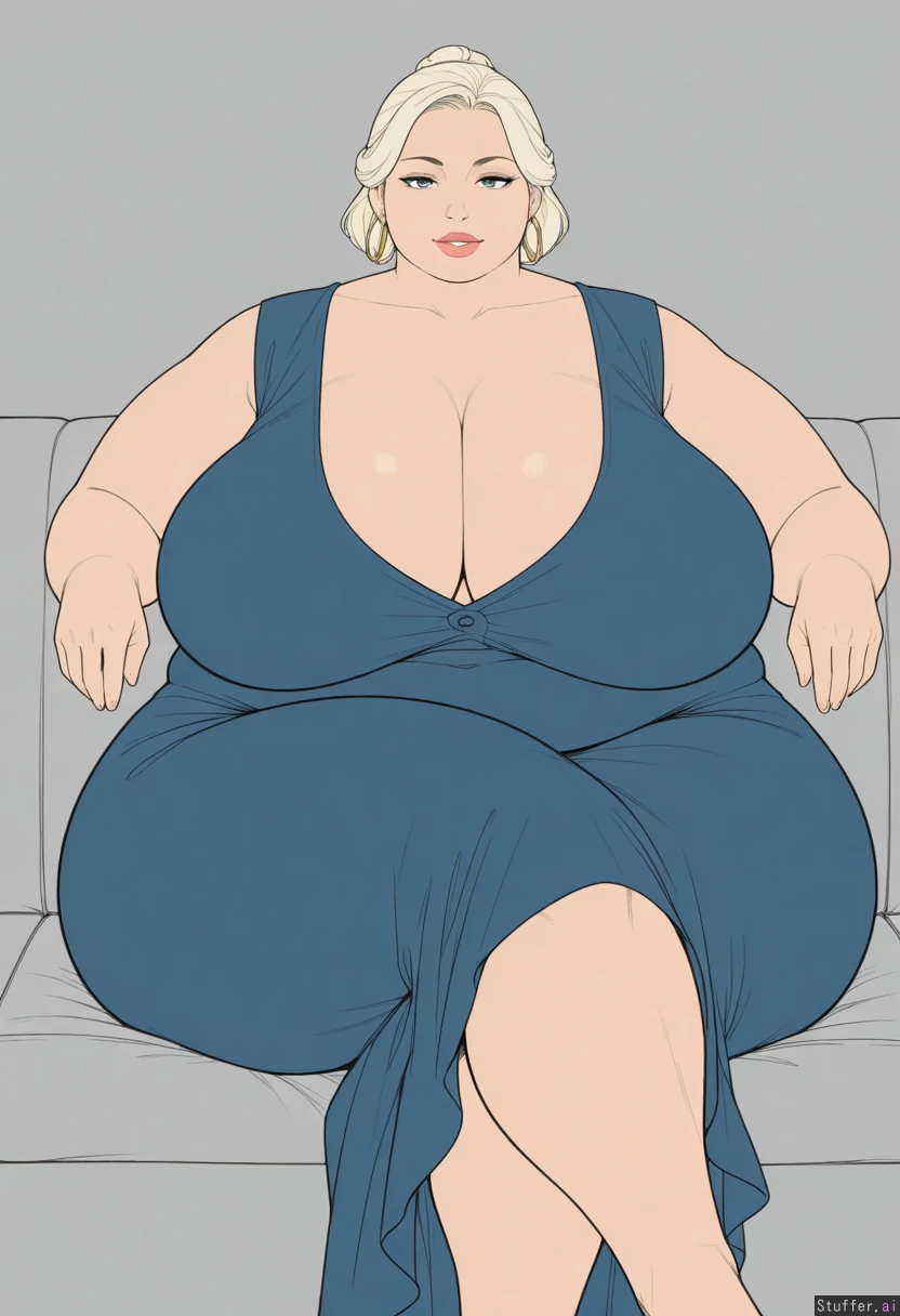 gigantic_breasts, sagging_breasts, massive_thighs, morbidly_obese_female, wife, crossed_legs, fine_outlines, flat_colors, long_breasts, (fat_arms:1.2), hoop_earrings, platinum_blonde_hair, makeup, plump_lips