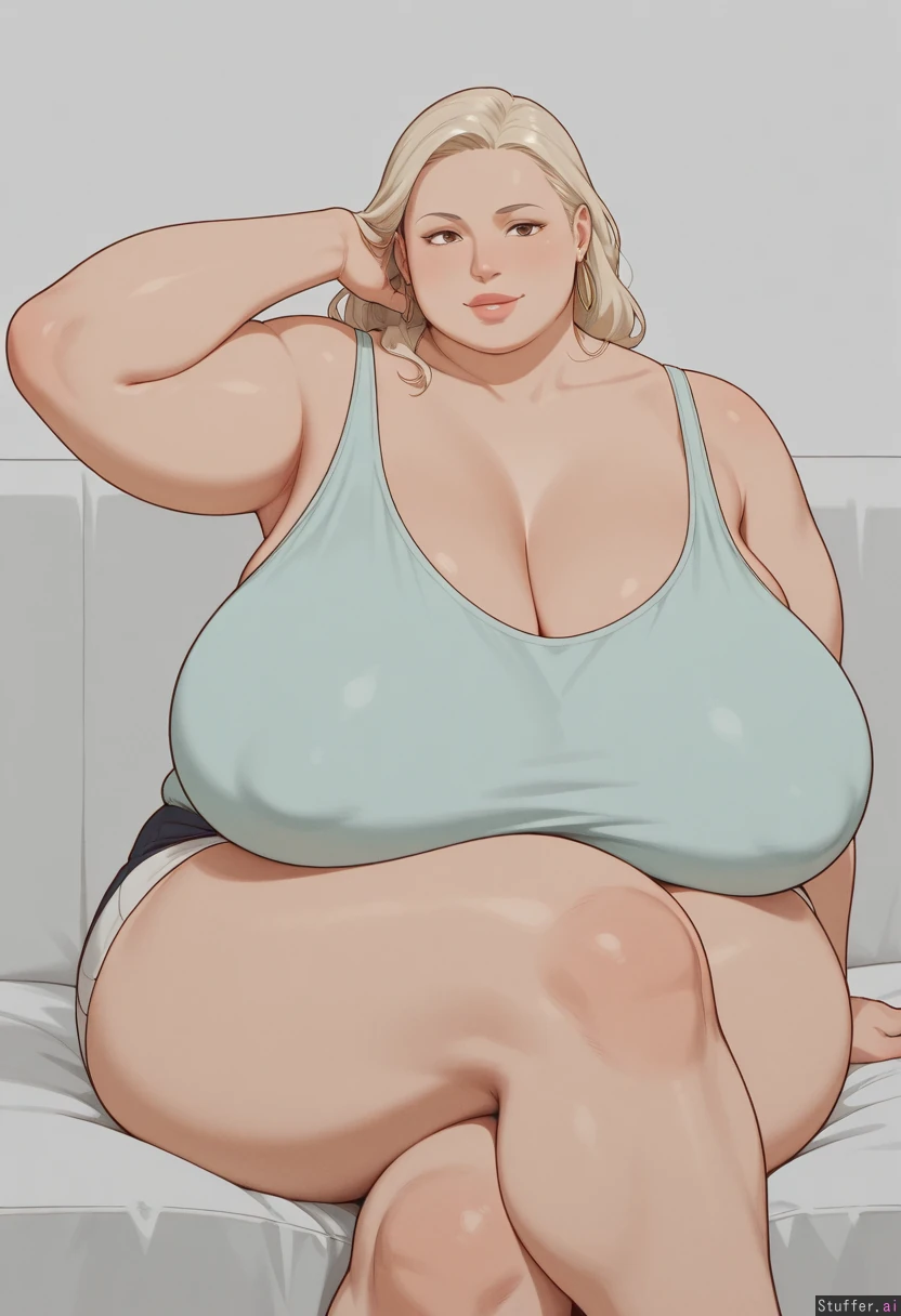 (gigantic_breasts:1.3), sagging_breasts, massive_thighs, morbidly_obese_female, wife, crossed_legs, fine_outlines, flat_colors, long_breasts, (fat_arms:1.4), hoop_earrings, platinum_blonde_hair, makeup, plump_lips, shirt