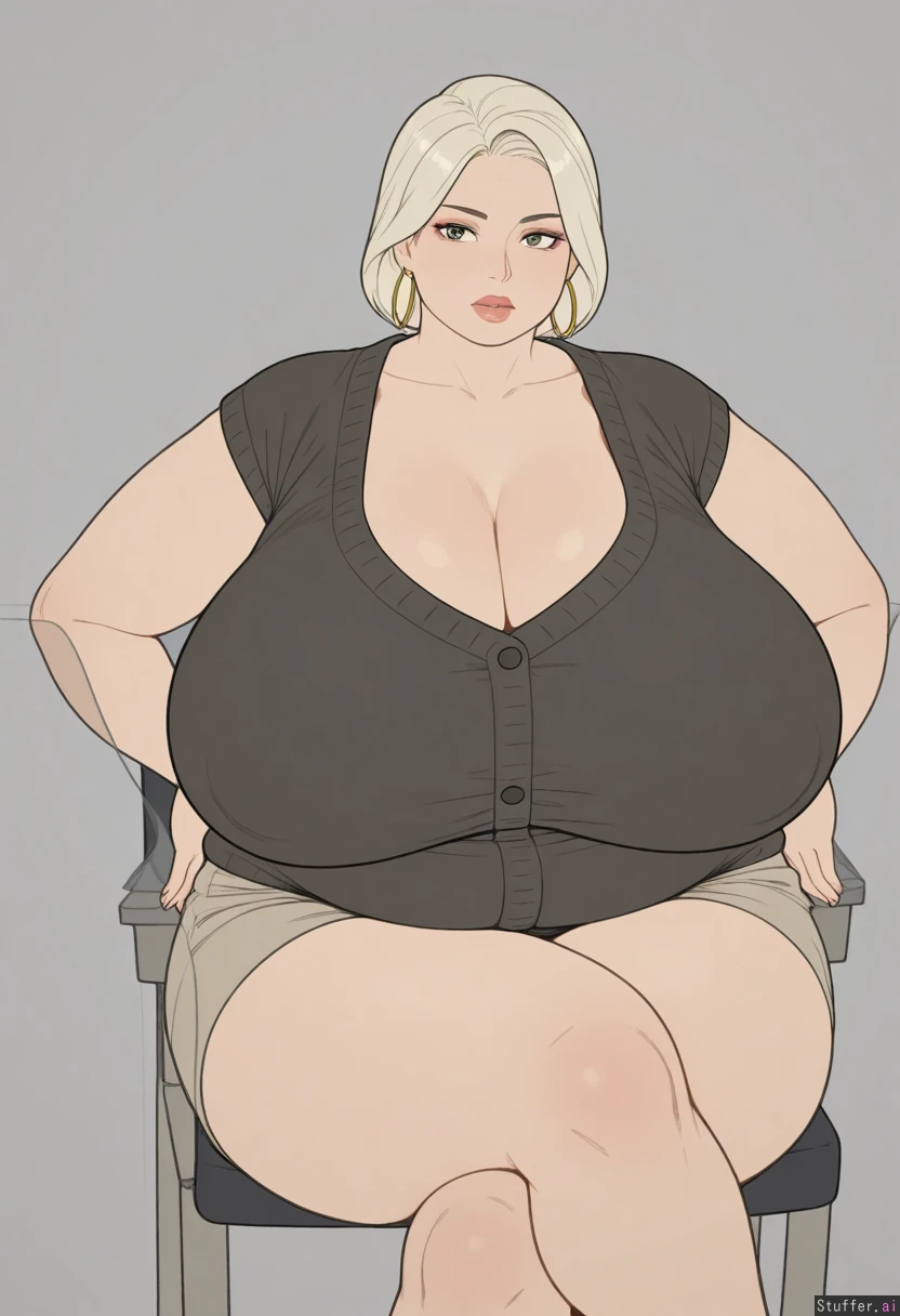 (gigantic_breasts:1.3), sagging_breasts, massive_thighs, morbidly_obese_female, wife, crossed_legs, fine_outlines, flat_colors, long_breasts, (fat_arms:1.4), hoop_earrings, platinum_blonde_hair, makeup, plump_lips, cardigan