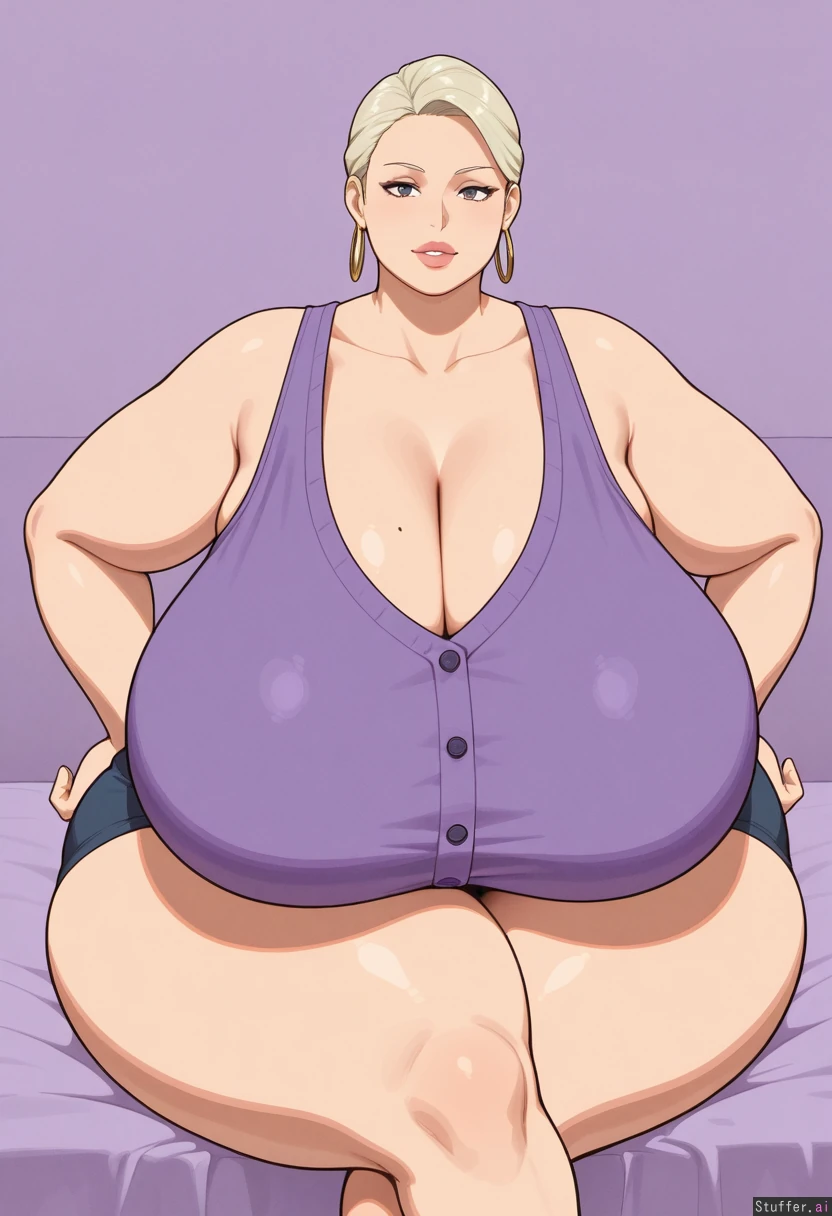 (gigantic_breasts:1.3), sagging_breasts, massive_thighs, morbidly_obese_female, wife, crossed_legs, fine_outlines, flat_colors, long_breasts, (fat_arms:1.4), hoop_earrings, platinum_blonde_hair, makeup, plump_lips, cardigan, wide_hips, wide_thighs, purple_streaks