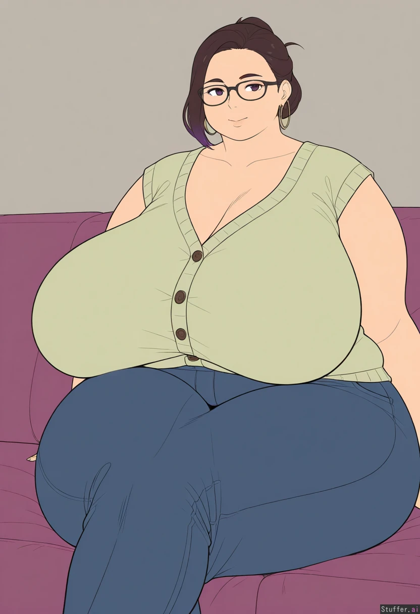 (gigantic_breasts:1.3), sagging_breasts, massive_thighs, morbidly_obese_female, wife, crossed_legs, fine_outlines, flat_colors, long_breasts, (fat_arms:1.4), hoop_earrings, cardigan, wide_hips, wide_thighs, purple_streaks