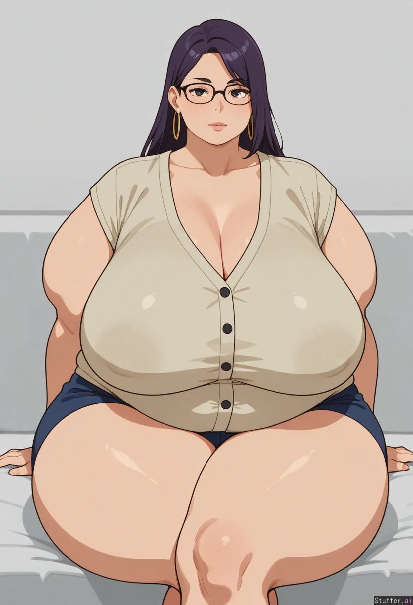 (gigantic_breasts:1.3), sagging_breasts, massive_thighs, morbidly_obese_female, wife, crossed_legs, fine_outlines, flat_colors, long_breasts, (fat_arms:1.4), hoop_earrings, cardigan, wide_hips, wide_thighs, purple_streaks