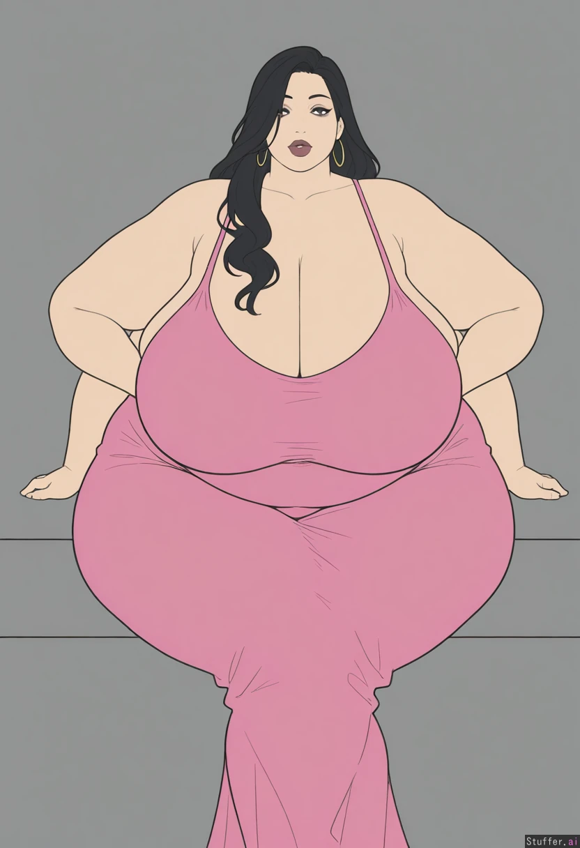 (gigantic_breasts:1.2), sagging_breasts, massive_thighs, morbidly_obese_female, wife, crossed_legs, fine_outlines, flat_colors, long_breasts, (fat_arms:1.5), hoop_earrings, wide_hips, wide_thighs, long_hair, pink clothes, plump_lips, dark_makeup, model