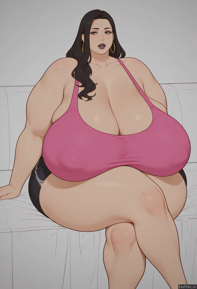 (gigantic_breasts:1.4), sagging_breasts, massive_thighs, morbidly_obese_female, wife, crossed_legs, fine_outlines, flat_colors, long_breasts, (fat_arms:1.5), hoop_earrings, wide_hips, wide_thighs, long_hair, pink top, black shorts, plump_lips, dark_makeup, model