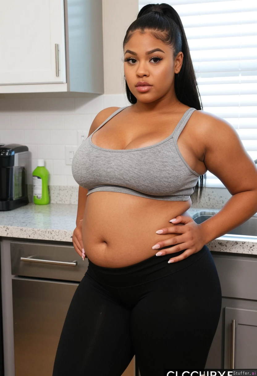 21 year old tan athletic ebony girl, model face, wearing tight gym clothes, standing in kitchen, chubby belly Plump lips Tight belly Massive tits